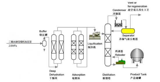 電子級二氧化碳以食品級二氧化碳為原料,采用深冷精餾+物理化學吸附的工藝生產。食品級二氧化碳純度一般在99.9%以上,雜質較少,CO、H2含量較低,利用純化新工藝,能有效的除去產品中相關的雜質,生產過程中原料損耗低、純化新工藝中的能量平衡並回收利用,電耗等較低,流程相對簡單可靠,產品收率高,投資省。